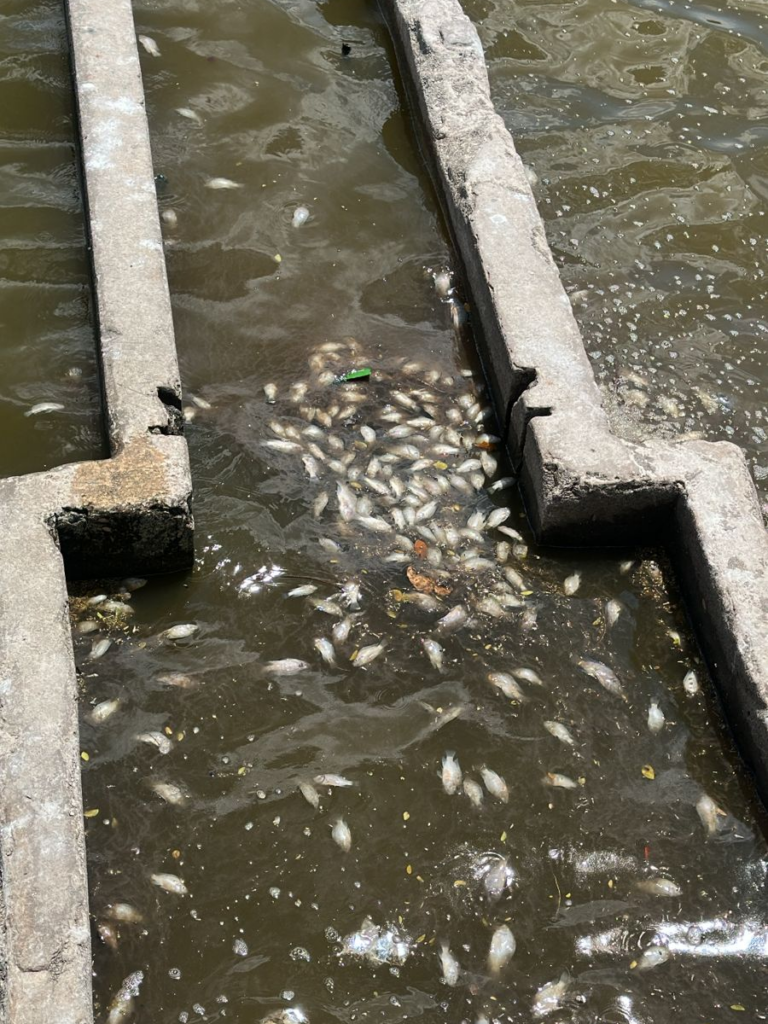Além do mau cheiro, pessoas relataram a presença de peixes subindo à superfície da água em busca de oxigênio. Muitos deles, no entanto, já foram encontrados mortos em diferentes pontos do açude, enquanto outros apresentavam sinais claros de dificuldade para respirar, permanecendo por alguns instantes na parte superior antes de retornar ao fundo. A cena indica o agravamento da contaminação da água e do desequilíbrio ambiental.