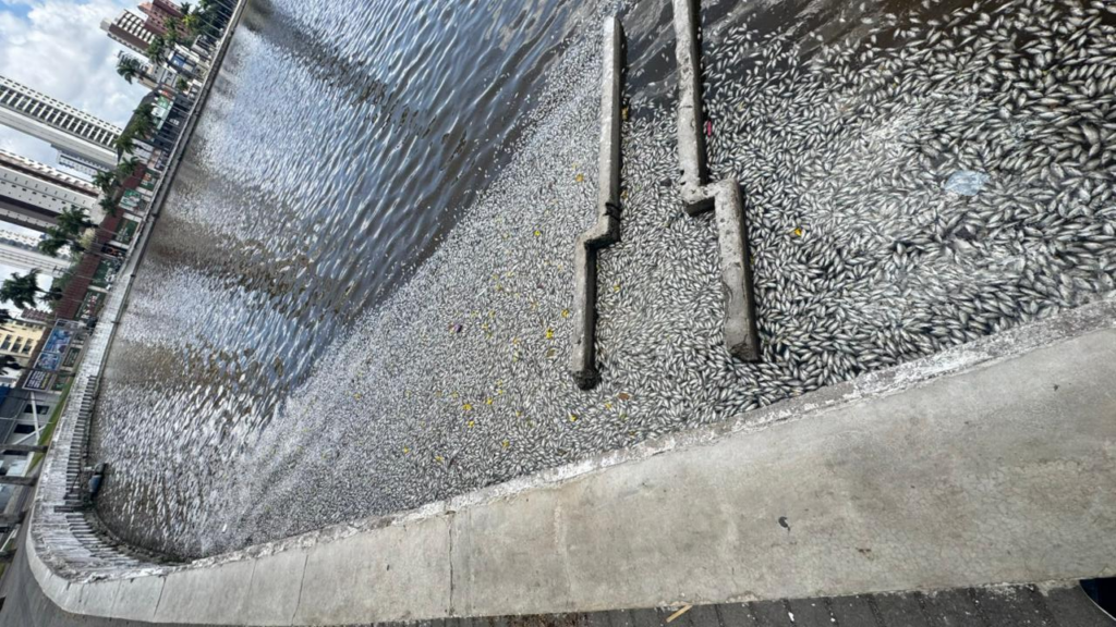 Cartão-postal da cidade volta a registrar odor forte, água turva e grande quantidade de peixes mortos, gerando preocupação entre moradores e comerciantes
