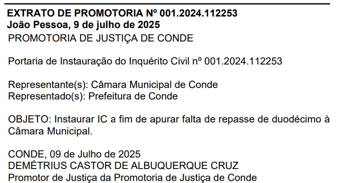 O promotor responsável pelo caso, Demétrius Castor de Albuquerque Cruz, solicitou que a Câmara se manifeste no prazo de 15 dias, apresentando documentos que comprovem os repasses e possíveis comunicações enviadas pela Prefeitura sobre o tema.